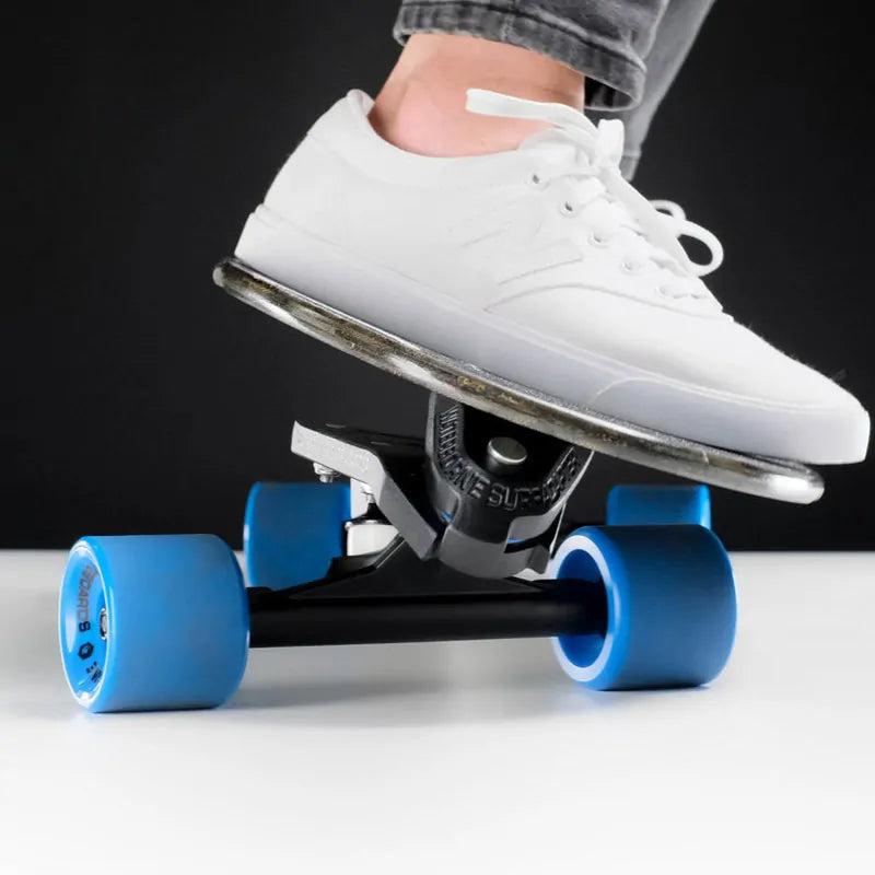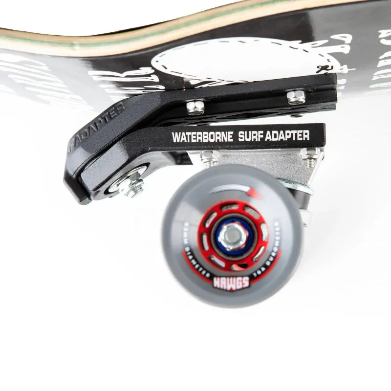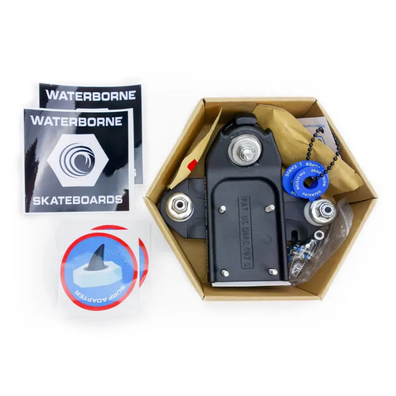 The Surf Adapter is an extremely robust design that has been mounted onto everything from 12-inch skateboards to 12-foot-long skateboards! It has been paired with every truck under the sun and ridden by people on all 7 continents. We believe that the Surf Adapter's design language aids in its mission for universal appeal. This robust design language is why the FIN System works. Had we taken a more common approach, had we copied an existing design, or had we put any less consideration, we would not have been able to add these clever little wedges to the Surf Adaper without significant further modification. It is only because waterborne found the best solution, the bushing, that we can change the pivot angle and still have the same functionality and resilience.
